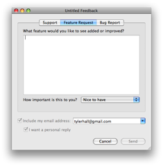 The idea for OpenFeedback came from Cultured Code's task management application Things. Clicking on the Support menu item in their Help menu brings up a dialog where you can submit questions and feedback from inside the app — no need to visit a website or open an email.