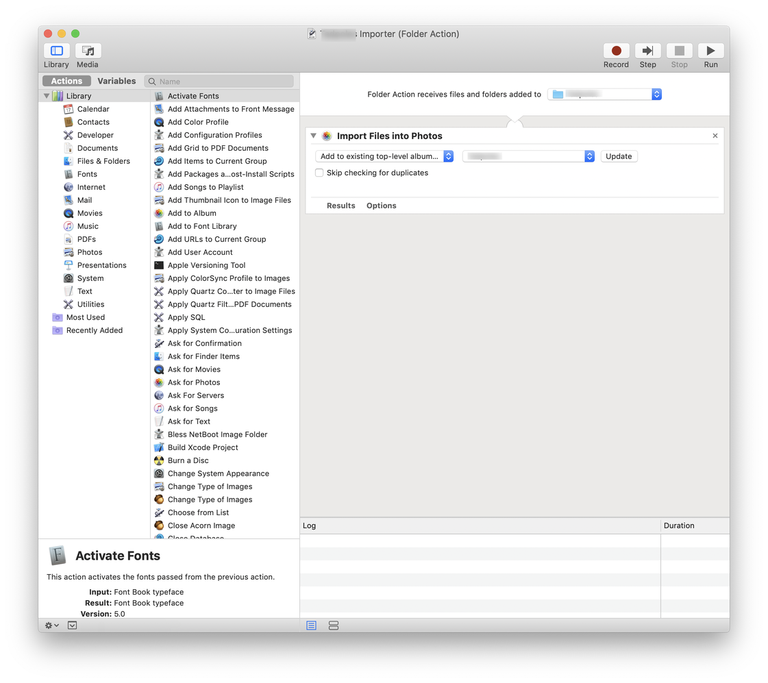 Next, my iMac at home runs a script every hour to download any new photos or videos from my server and puts them in a folder inside my Mac's "Pictures" folder. When that happens, a folder action I built with Automator automatically imports them into Apple's Photos.app, where they're synced to all of my mobile devices and iCloud. Soon after that, Google Photos on my iPhone will detect the new items and archive them in Google's cloud, where they're backed-up and made available on my wife's phone as well.