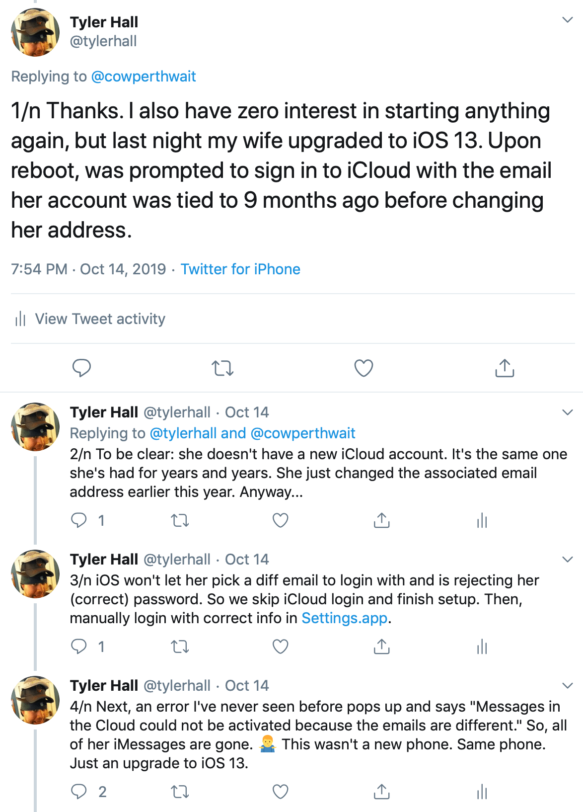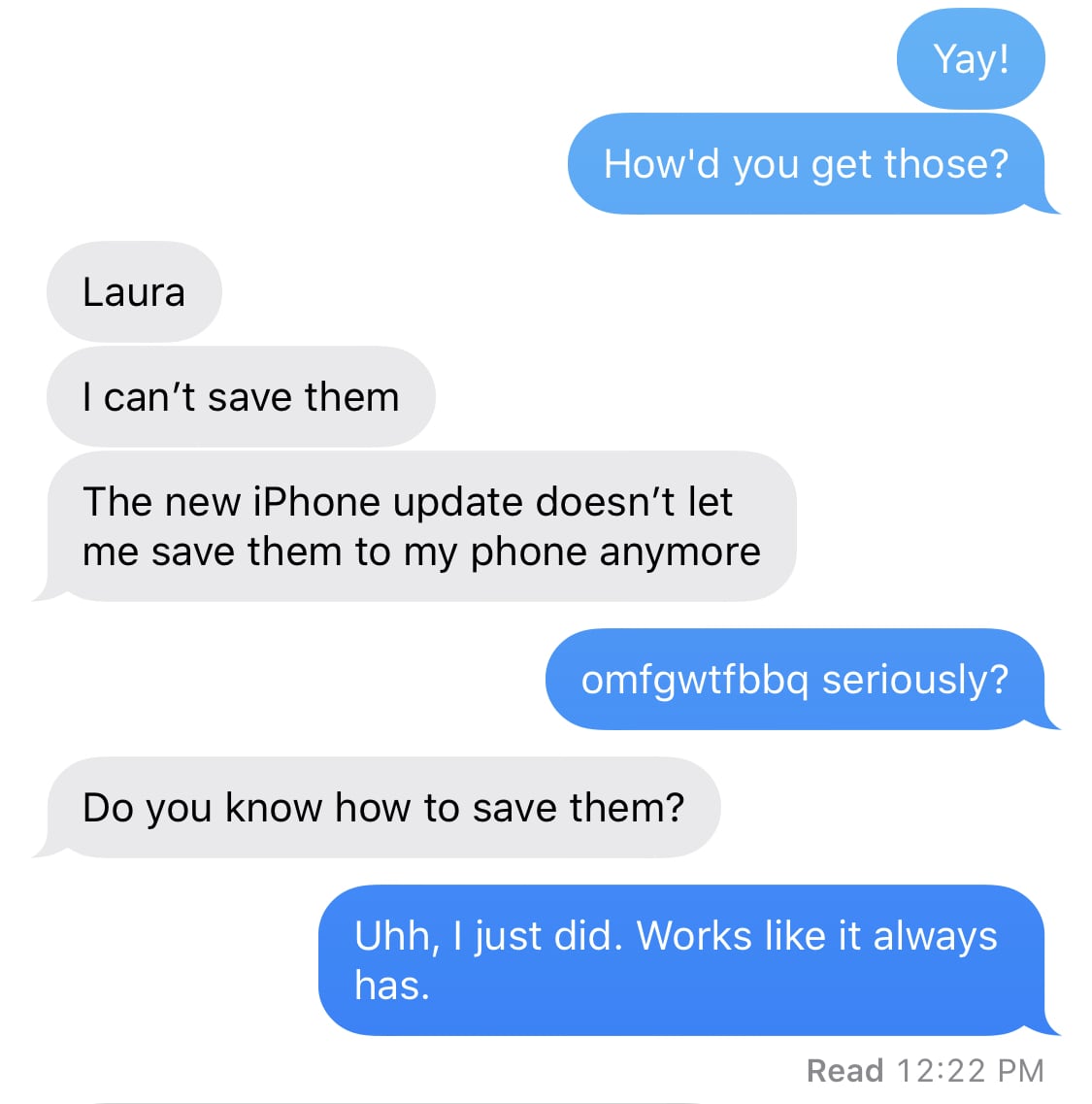 She claimed she couldn't save photos to her phone that someone else texted her. My first thought was "oh god, it's something to do with her iCloud account" that I tweeted about a few days ago.