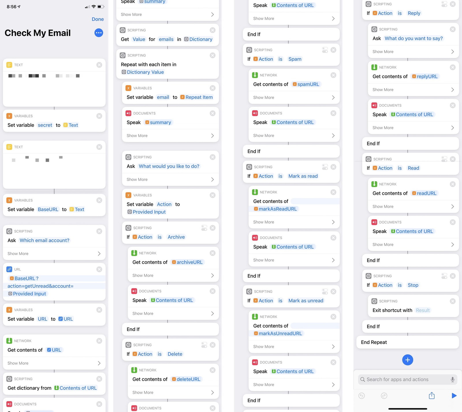 When you run the Shortcut, it connects to the PHP script, which fetches your email and returns it in a format optimized for the Shortcut to read, parse, and let you take action on.