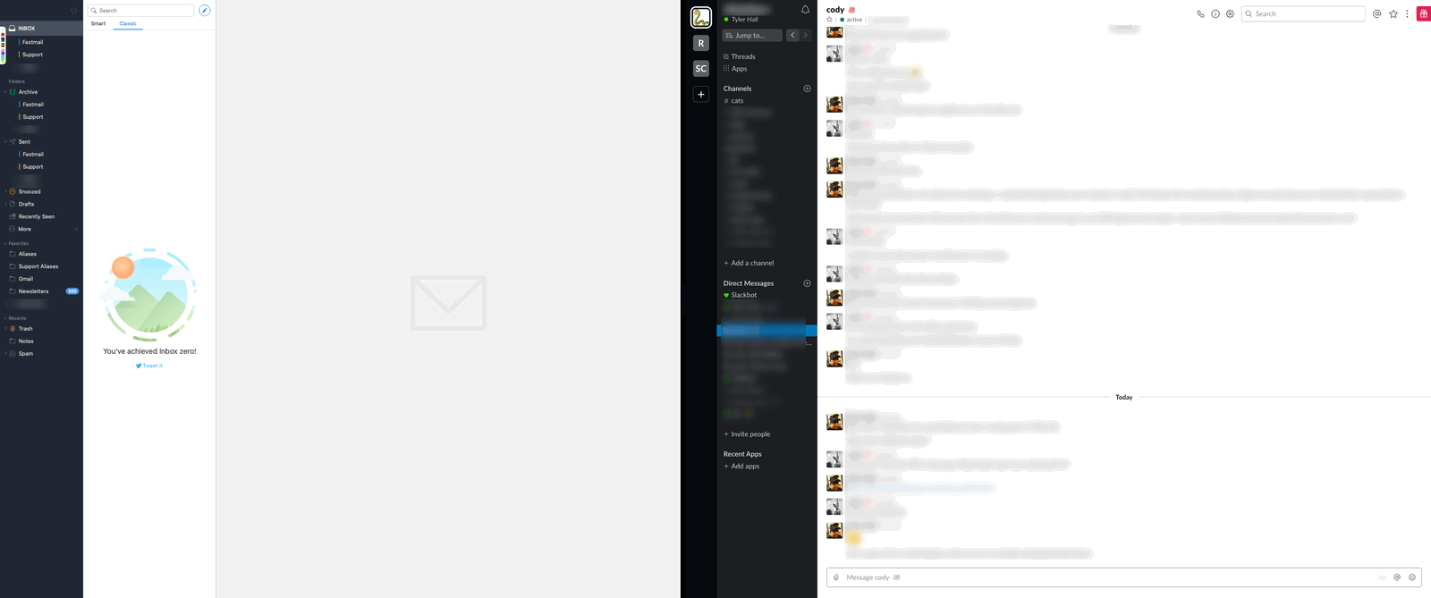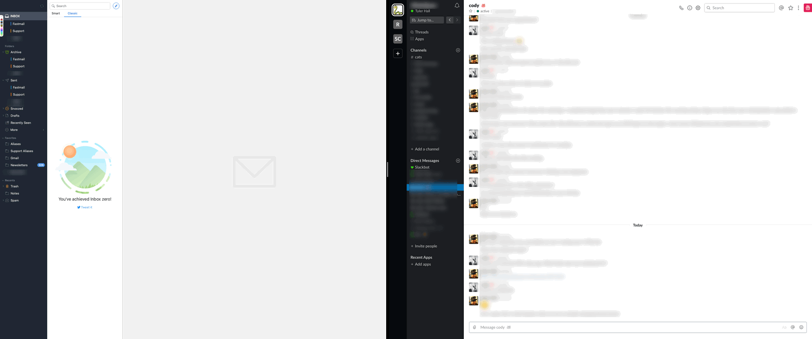 That's my Mac right now at work with Spark and Slack running fullscreen in Split View.