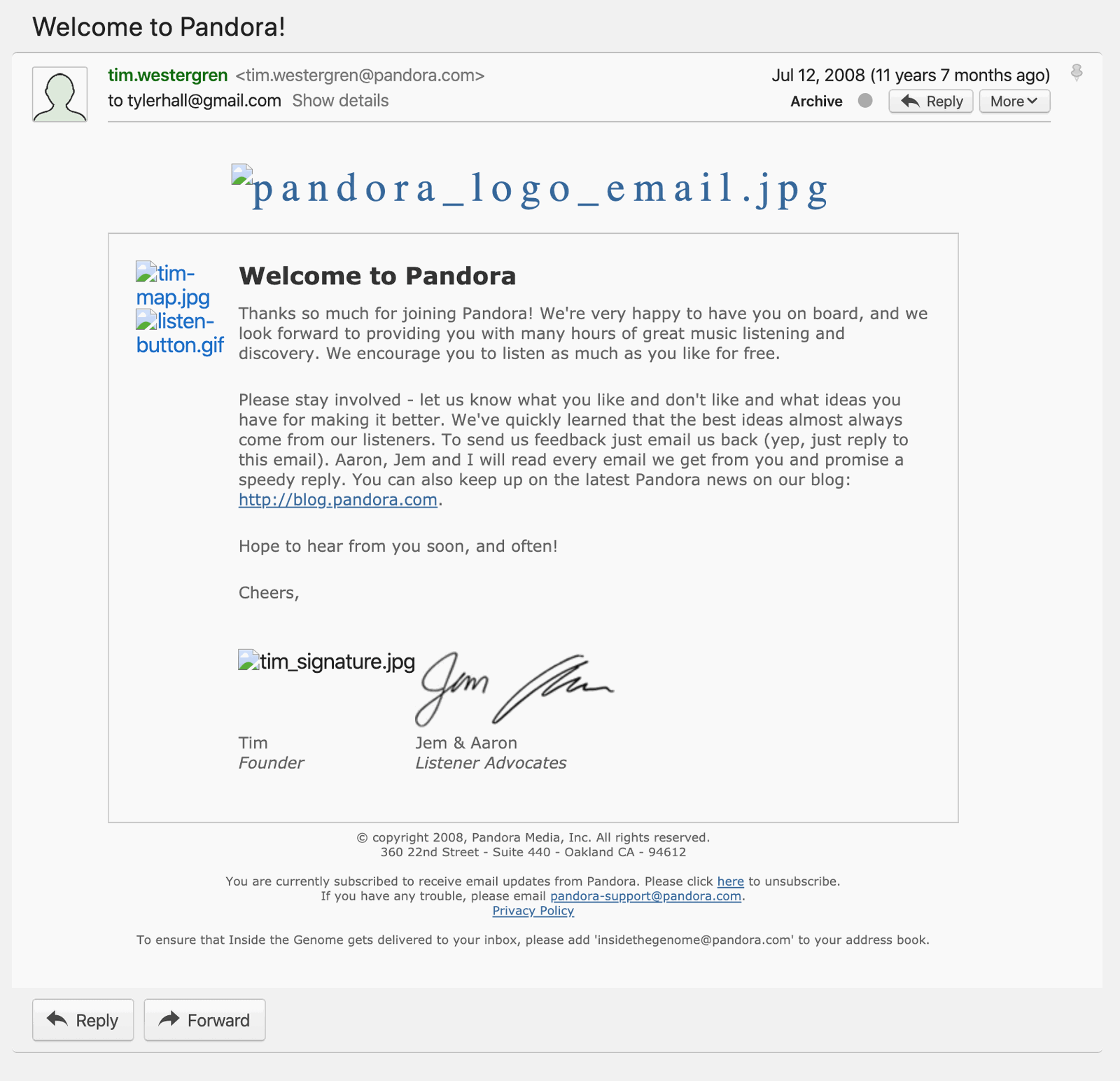 Again, searching my email archives, I found that I joined Pandora in July 2008 - back when the welcome email was still addressed from Tim.