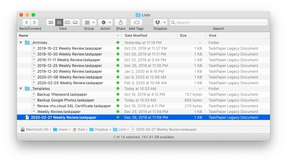 Listsis a top-level folder in my~/Dropbox. The checklists that are active / incomplete and that I'm currently working on live in this folder._Templatesstores the templates / original copies of the TaskPaper documents that I duplicate and work from._Archivesis where the files go once they're completed so I have a single place to search / reference in the future. Also, many times, it's where incomplete lists go once I give up and abandon one for whatever reason - as is often the case when I just don't get around to completely finishing my weekly review every Sunday.