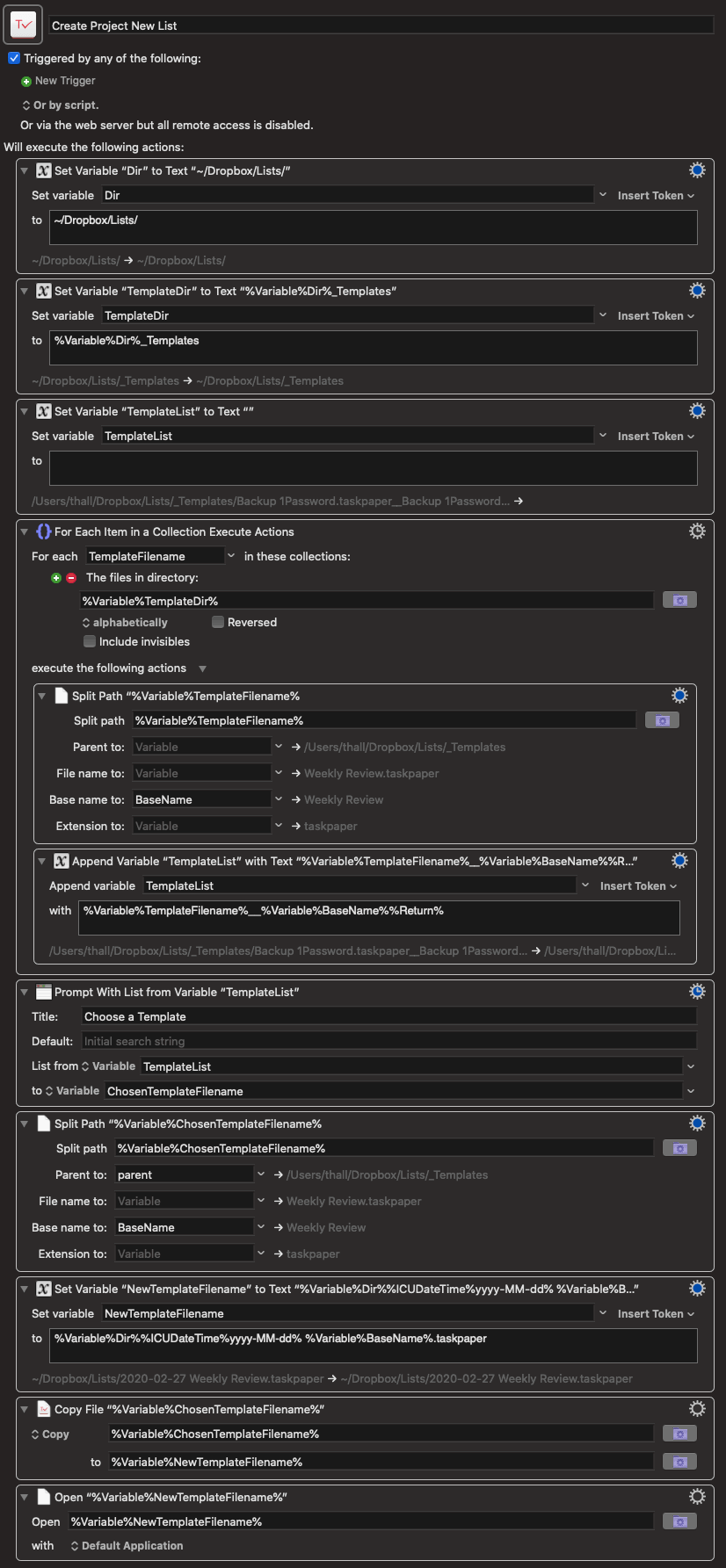 The macro is smart in that you don't have to manually specify each list you want to work with. Instead, just add a new template into the _Templates folder, and Keyboard Maestro will read its directory contents each time you run the macro. That way, everything's always current and available.