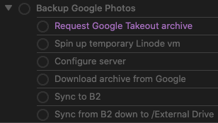 But, there's also a lot of complexity behind each of those actions. The "configure server" step involves running a shell script. Where should that be stored? I find it's a bit of a balancing act between keeping reference material contextualized alongside the task itself vs keeping it in some type of external storage (DEVONthink, Evernote, Apple Notes, Bear, etc). In this particular case, I like having it right there. And that's not very easy with OmniFocus. (This isn't me bitching about OF. I don't think or know if it should even be a use case they support. There are better tools for that job, which is what I'm leading up to.)
