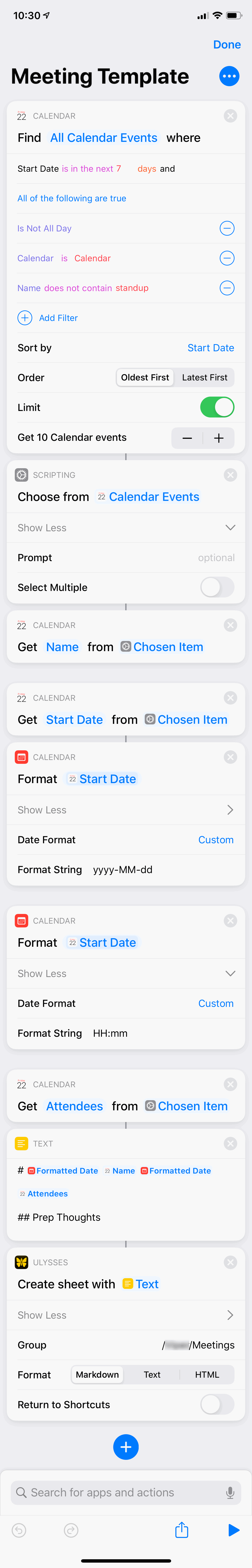 - Sends the new note to Ulysses and puts it in a specific folder with all of my other work meeting notes.