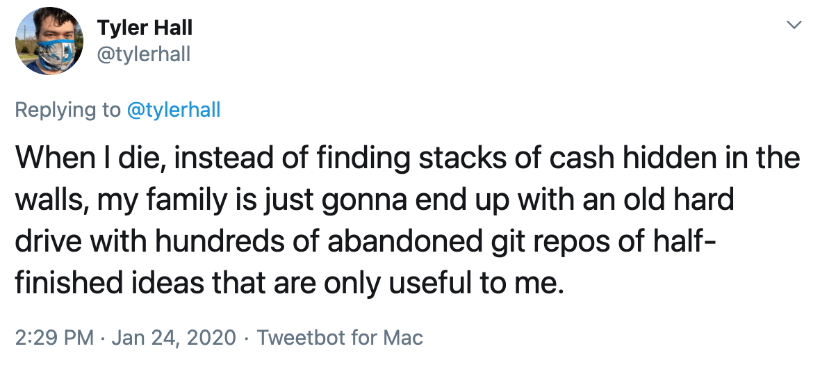 I made a joke on Twitter that my legacy and contribution to this world will be the hundreds of abandoned git repos my family finds on my computer when I die. (Or maybe even farther in the future than that.)