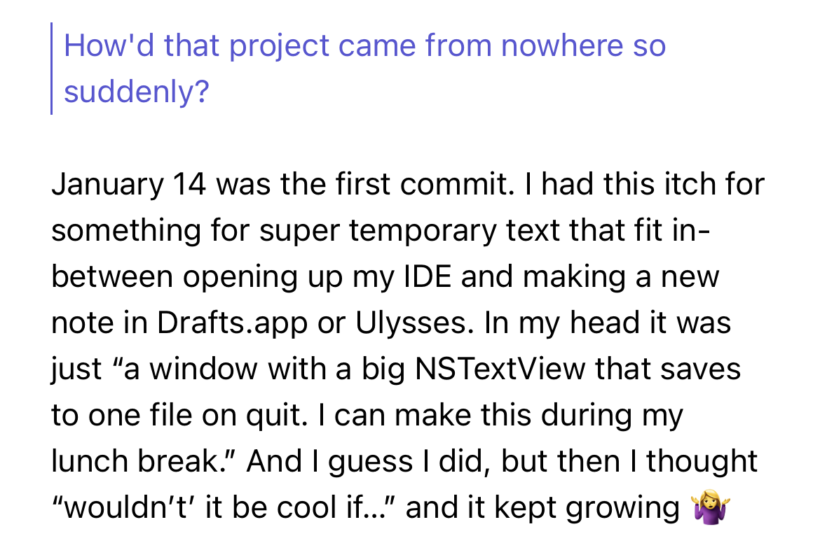 But now and then, I've felt a need for something to drop truly temporary text into — a staging ground to do a few quick edits before taking that text elsewhere. There's mental overhead to using those other three apps.