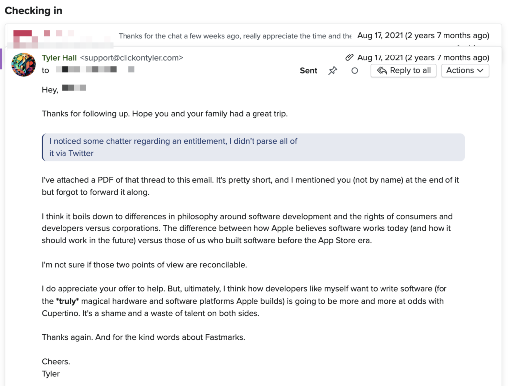 They followed up via email a few weeks later, offering to help fast-track an iOS entitlement I had requested (and complained about on Twitter). I figured this was likely my last chance to continue the conversation.